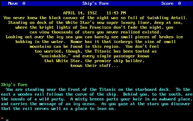 Beyond the Titanic is a text adventure game written by Scott Miller for MS-DOS, published by Apogee Software. In the game, the player has to escape from the sinking ship Titanic.