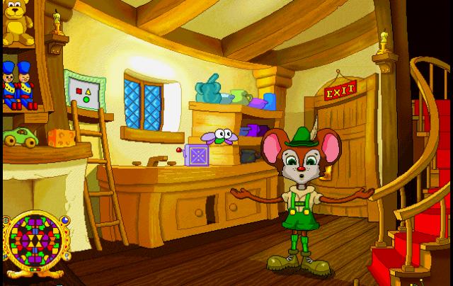 When the player starts the game, he/she can select an area of the game to go to, e.g. the staircase or the mouse hole. Once an area is selected, instructions are given, and the player watches an animation of the actions on the screen before playing the activity on their own. A couple of activities have the ability to stretch or shrink the selected shape to make it fit for example. During an activity, Hickory will give the player feedback if he/she did it correctly or he/she needed to try again if a mistake is being made. Educational concepts involve colour and shape recognition, sorting/classifying and patterns.